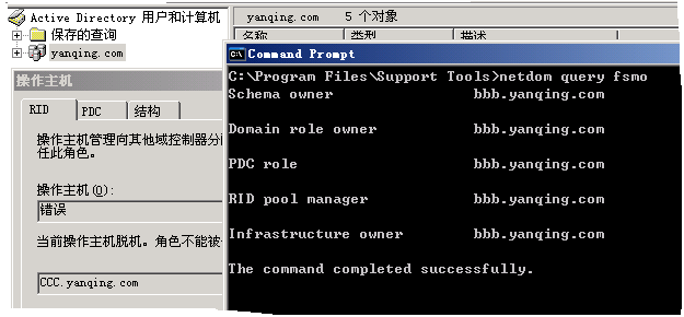 14、這五個步驟完成以后,檢查一下是否全部轉(zhuǎn)移到BDC 上了,打開在第9步時裝windows support tools,開始->程序->windows support tools->command prompt, 輸入netdom query fsmo , 如圖:全部轉(zhuǎn)移成功. 現(xiàn)在五個角色的owner 都是ccc 了.