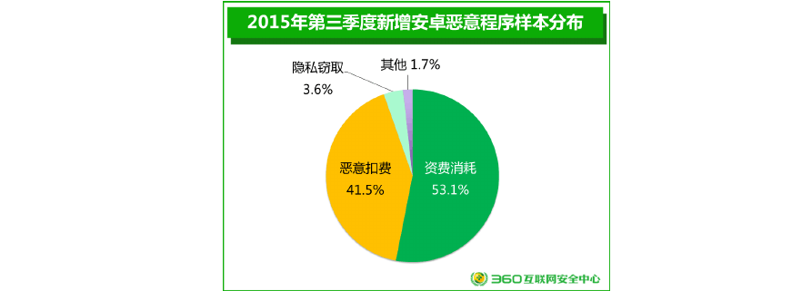 ,根據(jù)中國反網(wǎng)絡病毒聯(lián)盟的分類標準,360互聯(lián)網(wǎng)安全中心在2015年第三季度監(jiān)測的移動平臺惡意程序的分類統(tǒng)計如下圖。從圖中可見,2015年第三季度安卓平臺新增惡意程序主要是資費消耗,占比為53.1;其次為惡意扣費(41.5)和隱私竊?。?.6),這三類惡意程序占總量的98.3,其余類型的惡意程序新增量只占到1.7。