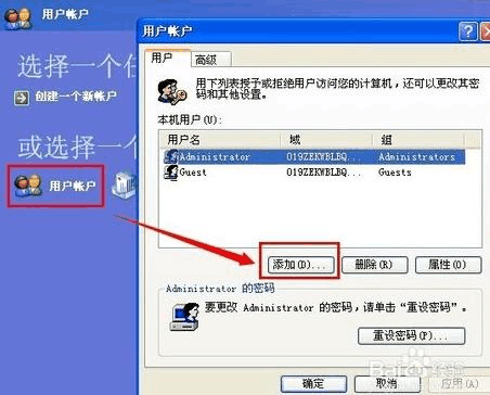 提示錄入域控服務器管理員的用戶名和口令(即服務器B 管理員用戶名、口令),等待幾十秒(視網速、服務器B 配置而定)后會提示歡迎加入XX.COM 域。此時加入域成功,但還需要再設置權限。依然在需要加入域的客戶機上操作:點擊“開始”菜單,點擊“設置”、“控制面板”,打開“用戶賬戶”,點擊“添加”按鈕。