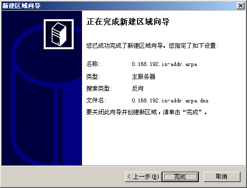 創(chuàng)建反向搜索區(qū)域。在圖1.5所示的DNS 管理控制臺中,右擊“反向搜索區(qū)域”,在彈出的快捷菜單中單擊“新建區(qū)域”,然后按出現(xiàn)的“新建區(qū)域向?qū)А睂υ捒蛱崾静僮?。在“反向搜索區(qū)域”對話框的“網(wǎng)絡(luò)ID ”欄中鍵入本實(shí)驗(yàn)的網(wǎng)絡(luò)ID “192.168.0”,系統(tǒng)就創(chuàng)建名為“0.168.192in-addr.arpa ”的反向搜索區(qū)域。最后如圖1.6所示。