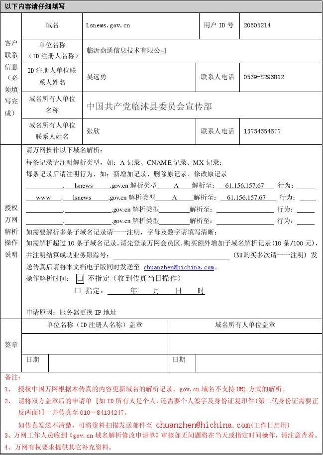 中國(guó)萬網(wǎng)----領(lǐng)先的互聯(lián)網(wǎng)應(yīng)用服務(wù)提供商鑒于gov.cn 域名的重要性,請(qǐng)您認(rèn)真填寫以下內(nèi)容,我們將由專業(yè)的工程師為您操作,以確保準(zhǔn)確無誤。gov.cn 域名解析修改申請(qǐng)單服務(wù)熱線:400-600-