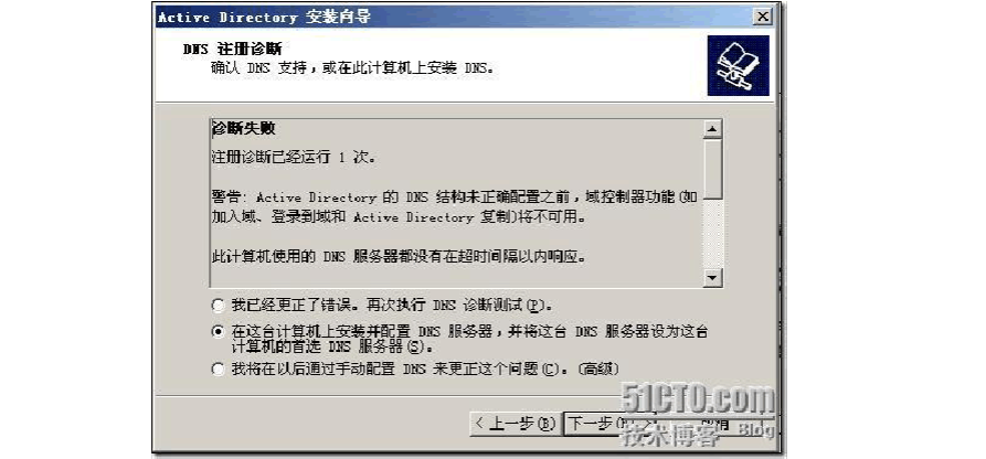 1.2、 安裝活動(dòng)目錄的過程中,同樣也可以安裝DNS 服務(wù)器,活動(dòng)目錄的安裝過程就不做過多演示了,安裝過程中出現(xiàn)下面的界面,其中中間的哪項(xiàng)就是安裝活動(dòng)目錄的過程中也安裝了DNS 服務(wù)器,這樣安裝的DNS 服務(wù)器有域的SRV 記錄,當(dāng)客戶機(jī)加入域的時(shí)候就需要這些SRV 記錄進(jìn)行定位。