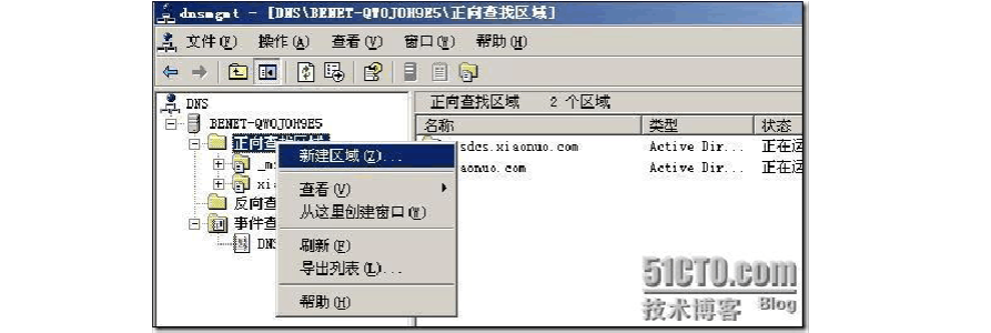 2.2、 創(chuàng)建正向查找區(qū)域(正向查詢由域名查找IP 地址)右擊“正向查找區(qū)域”選擇“新建區(qū)域”