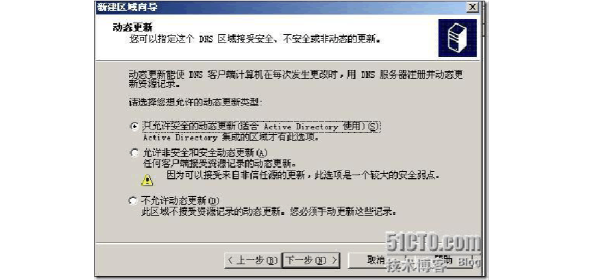 此項(xiàng)動(dòng)態(tài)更新是指當(dāng)DNS 客戶端在發(fā)生更改時(shí),可以使用DNS 服務(wù)器注冊(cè)和動(dòng)態(tài)更新其資源記錄。它減少了對(duì)區(qū)域記錄進(jìn)行手動(dòng)管理的需要。這種功能給活動(dòng)目錄中的DNS 維護(hù)帶來了方便。當(dāng)計(jì)算機(jī)加入域時(shí),可以在活動(dòng)目錄中自動(dòng)添加該計(jì)算機(jī)的主機(jī)資源記錄。