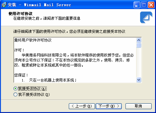 4) 閱讀 Winmail Server 的使用許可,同意后選擇“我接受該協(xié)議”,然后點(diǎn)擊“下一步”繼續(xù)安裝