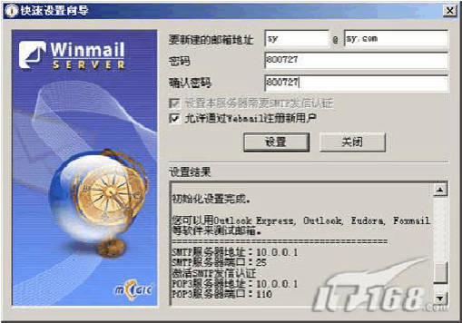 1. 快速設(shè)置向?qū)?。如下圖所示,首先輸入要新立的郵箱地址和使用密碼,然后點(diǎn)“設(shè)置”,設(shè)置向?qū)?huì)自動(dòng)查找系統(tǒng)數(shù)據(jù)庫(kù)中是否存在要建的郵箱及域名,同時(shí)也會(huì)測(cè)試 POP3、SMTP 、HTTP 和ADMIN 服務(wù)器是否成功啟動(dòng);之后會(huì)在“設(shè)置結(jié)果”框內(nèi)顯示測(cè)試信息和有關(guān)郵件客戶(hù)端的配置信息,也給出了WEB 管理地址。