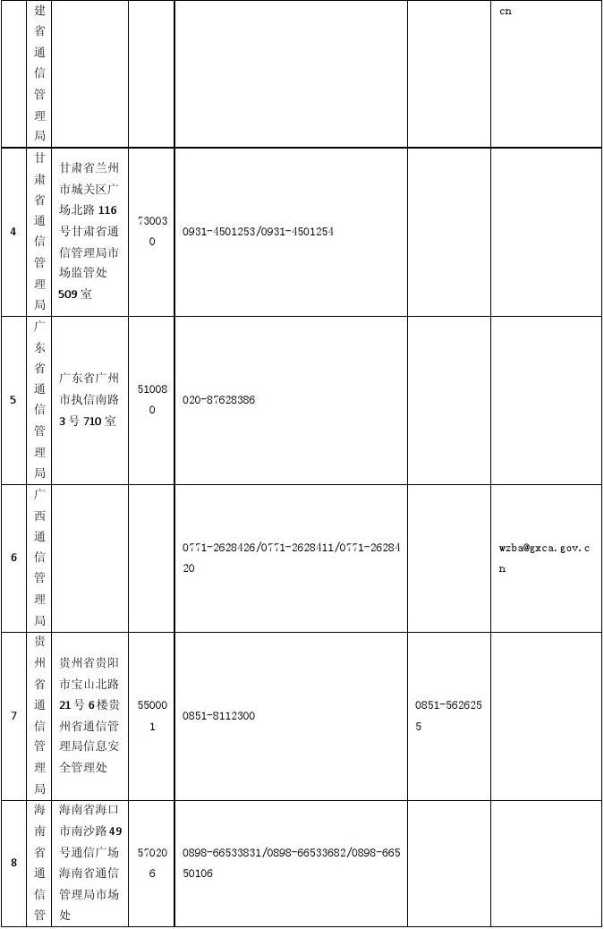備案所需各地通信管理局郵寄地址及電子郵箱列表
