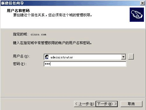 第五步:輸入對方域的管理員用戶和密碼。按下一步。