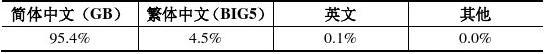 7. 網(wǎng)頁的編碼形式:分為簡(jiǎn)體中文、繁體中文、英文和其他。其統(tǒng)計(jì)方法是根據(jù)網(wǎng)頁本身的信