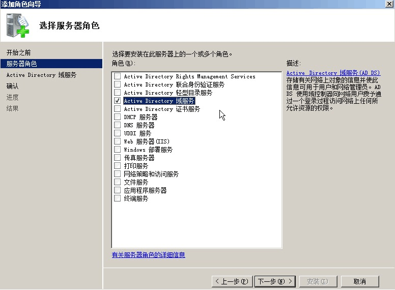 在服務(wù)器角色中選擇AD 域服務(wù)(DNS不可與AD 一起勾選)