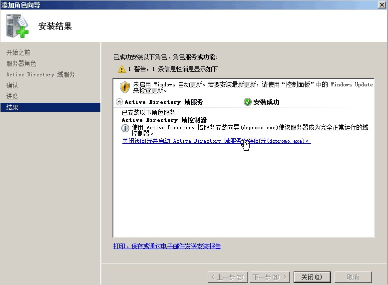 提示用戶進(jìn)行AD 域服務(wù)安裝向?qū)У倪M(jìn)行,點(diǎn)擊該連接進(jìn)入域服務(wù)安裝向?qū)?/p>