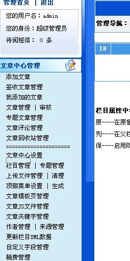 其中需要注意的是“添加文章”與“欄目管理”這兩個(gè)選項(xiàng)。