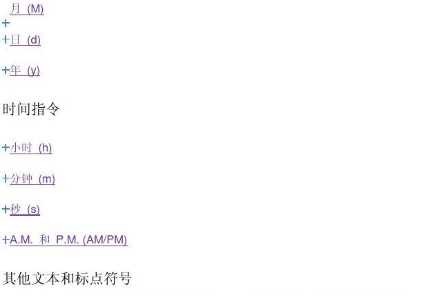 ? 文本 此格式項目顯示任何指定的文本,在日期或時間。將文本括在單引號中。例如對