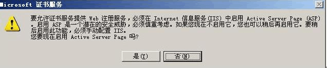 由于安裝證書服務(wù)的時(shí)候系統(tǒng)會(huì)自動(dòng)在IIS 中(這也是為什么必須先安裝IIS 的原因)添加證書申請(qǐng)服務(wù),該服務(wù)系統(tǒng)用ASP 寫就,所以必須為IIS 啟用ASP 功能,點(diǎn)擊‘是’繼續(xù)安裝: