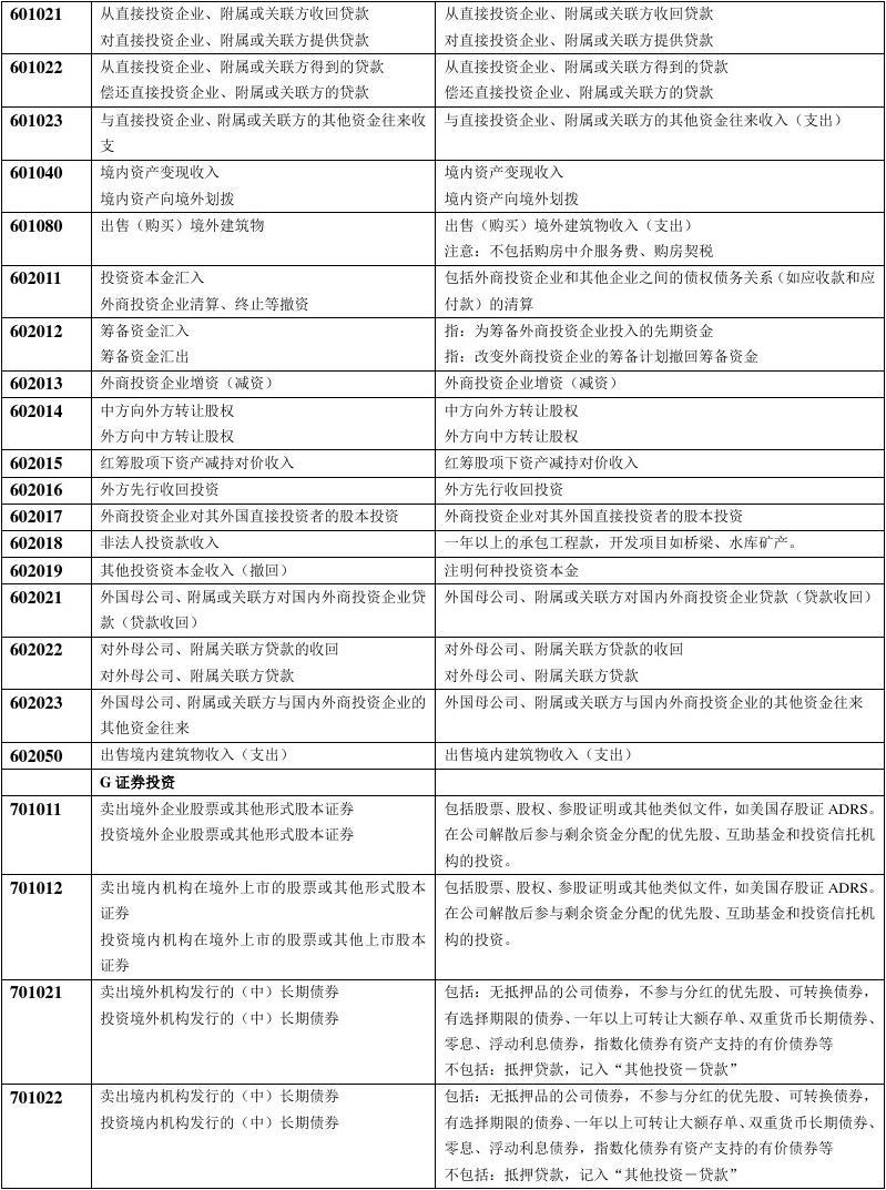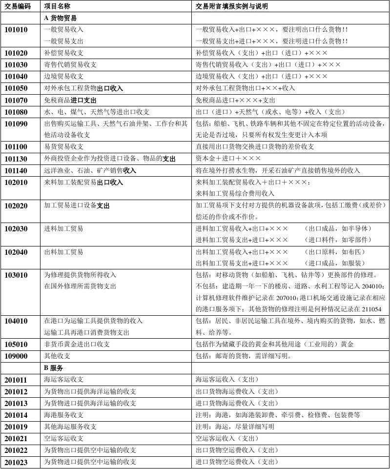 一般貿(mào)易收入/支出???????????????????????????????????101010 補(bǔ)償貿(mào)易收入/支出???????????????????????????????????101020 寄售代銷(xiāo)貿(mào)易收入/支出?????????????????????????????????101030 邊境貿(mào)易收入/支出???????????????????????????????????101040 對(duì)外承包工程貨物出口 ?????????????????????????????????101050 租賃貿(mào)易收入/支出???????????????????????????????????101060 免稅商品進(jìn)口 ?????????????????????????????????????101070 水、電、煤氣、天然氣等出口/進(jìn)口????????????????????????????101080 出售/購(gòu)買(mǎi)運(yùn)輸工具、天然氣石油井架、工作臺(tái)和其他活動(dòng)設(shè)備????????????????101090 易貨貿(mào)易收入/支出???????????????????????????????????101100 接受/提供國(guó)家間、國(guó)際組織無(wú)償援助和贈(zèng)送的物資?????????????????????101110 國(guó)內(nèi)機(jī)構(gòu)或個(gè)人提供無(wú)償援助和贈(zèng)送的物資/接受華僑、港澳臺(tái)同胞、外籍華人等捐贈(zèng)的物資???101120 外商投資企業(yè)作為投資進(jìn)口設(shè)備、物品的支出 ???????????????????????101130 遠(yuǎn)洋漁業(yè)、石油、礦產(chǎn)銷(xiāo)售收入 ?????????????????????????????101140 102用于加工的貨物