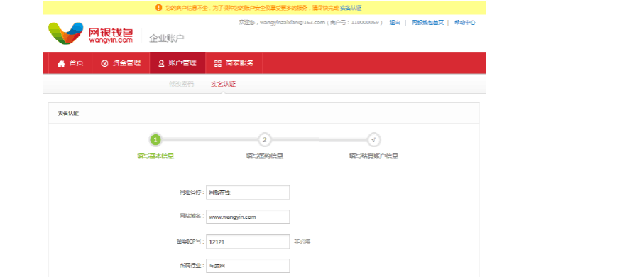 步驟4. 登錄網(wǎng)銀錢包并發(fā)起實名認證 – 成功登錄網(wǎng)銀錢包后,點擊頁面頂端的“實名認證”按鈕發(fā)起實名認證。