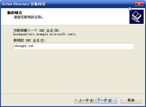 ,⑷單擊“下一步”按鈕,輸入以你的名字命名的新域的名稱,如:“zhongyy.com ”,如圖1-5所示: