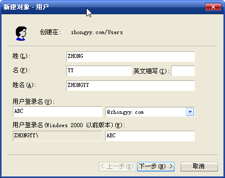 ⒀展開“zhongyy.com ”節(jié)點,右鍵單擊“Users ”容器,在彈出的快捷菜單中選擇“新建” →“用戶”,打開新建用戶窗口,填入用戶登陸名“ABC ”, 姓“ZHONG ”, 名“YY ”,如圖1-10所示