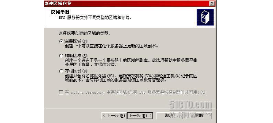 一般我們使用較多的是正向區(qū)域,而且從邏輯上考慮,必然是先創(chuàng)建主要區(qū)域,因?yàn)檩o助區(qū)域和存根區(qū)域都需要從主要區(qū)域復(fù)制數(shù)據(jù),因此我們現(xiàn)在的任務(wù)是要為區(qū)域hexun.com 創(chuàng)建一個(gè)正向的主要區(qū)域。如下圖所示,我們?cè)贒NS 服務(wù)器上選擇創(chuàng)建一個(gè)正向區(qū)域。