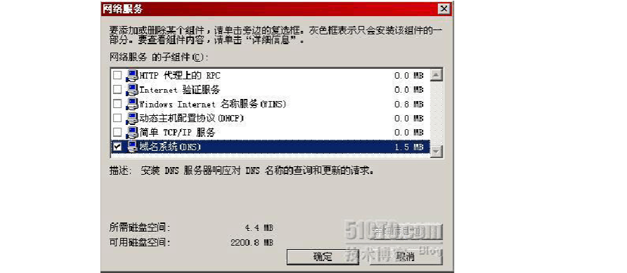 安裝DNS 組件非常簡單,依次點(diǎn)擊 控制面板-添加或刪除程序-添加/刪除W indows 組件-網(wǎng)絡(luò)服務(wù),如下圖所示,選擇“域名系統(tǒng)”即可。