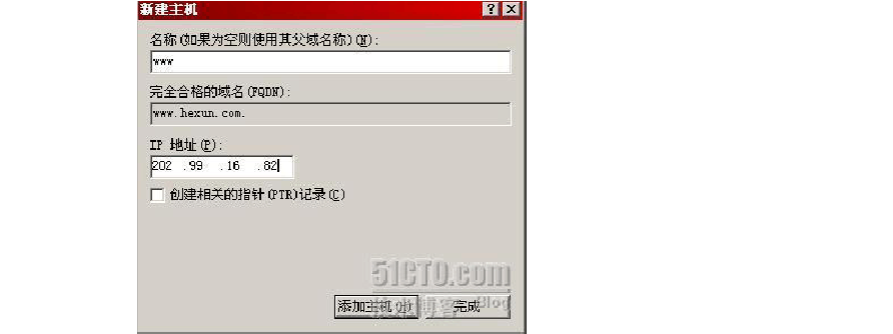 A 記錄也稱為主機(jī)記錄,是使用最廣泛的DNS 記錄,A 記錄的基本作用就是說明一個(gè)域名對(duì)應(yīng)的IP 是多少,例如,我們想通過A 記錄說明一臺(tái)主機(jī)的域名是bbs.hexun.com ,IP 是202.99.16.185,那么我們就可以進(jìn)行下列操作。如下圖所示,我們?cè)趆exun.com 區(qū)域中選擇“新建主機(jī)”。