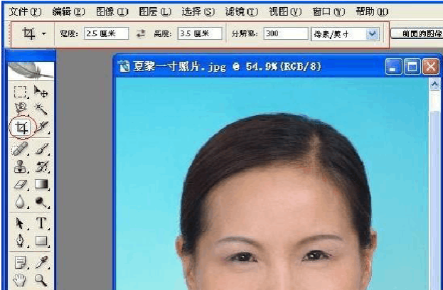 2. 在工具欄, 點裁剪工具(調(diào)寬度:2.5厘米, 高度:3.5厘米, 分辨率:300像素), 在照片上選取合適的位置, 點屬性欄(確定√)(如下圖)