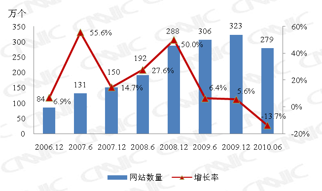 截至2010年6月,中國的網(wǎng)站數(shù),即域名注冊(cè)者在中國境內(nèi)的網(wǎng)站數(shù)(包括在境內(nèi)接入和境外接入)減少到279萬個(gè),降幅13.7。