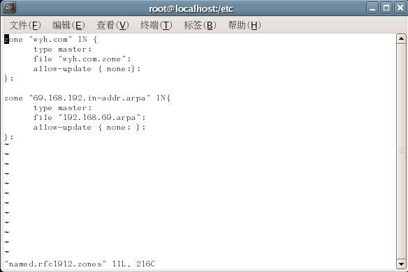 2、使用vi 命令編輯named.rfc1912.zones 文件