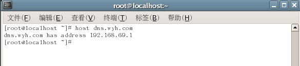 7、接下來測試DNS 的解析是否生效。首先修改/etc/resolv.conf文件,設置nameserver 的IP 地址就是本機DNS 服務器的IP 地址192.168.69.1。