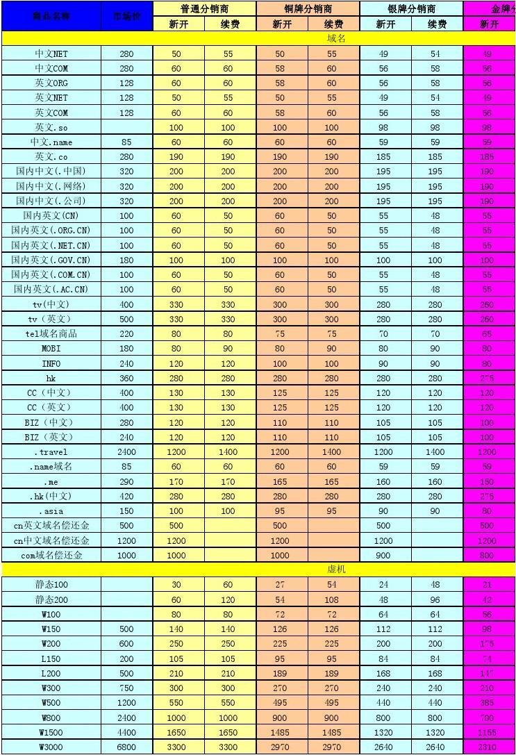 2011年新網(wǎng)分銷商各級(jí)別價(jià)格表