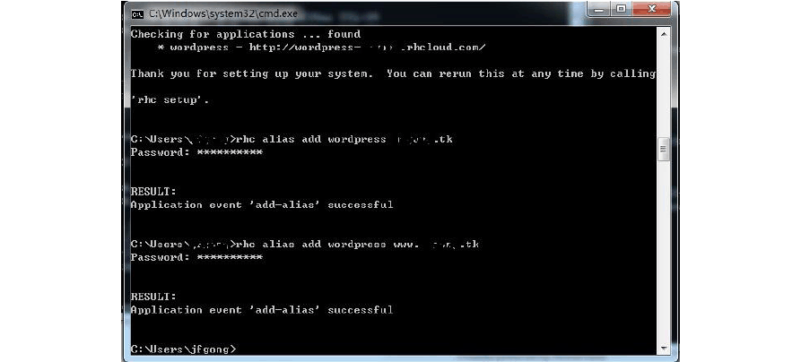 Openshift 支持綁定頂級(jí)域名,接下來需要將wordpress 綁定到domain.tk 域名上,即為wordpress 添加別名。安裝RailsInstaller (其中包含ruby ),然后使用cmd 執(zhí)行g(shù)em install rhc ,綁定命令是rhc alias add AppName domain.tk 。同樣建議添加兩個(gè)別名www.domain.tk 和domain.tk 。