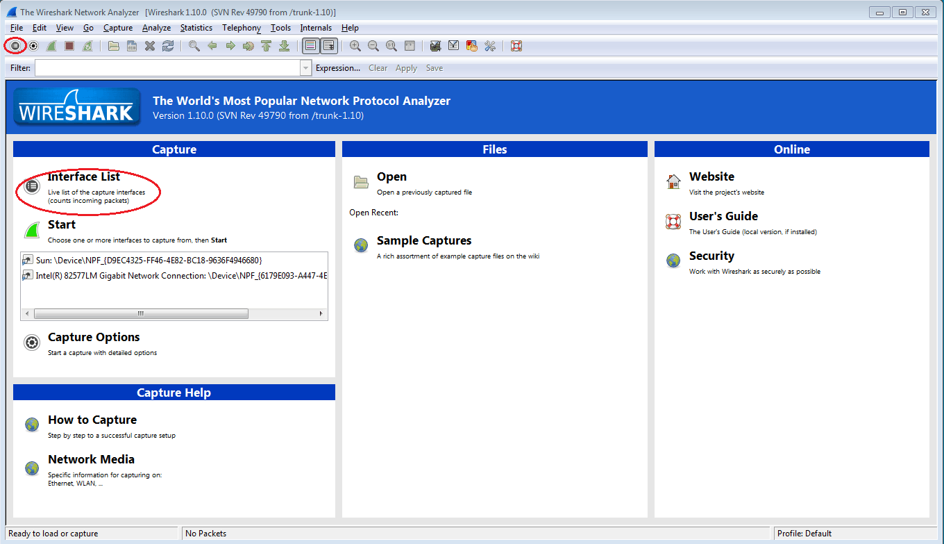 b. 在 Wireshark 啟動之后,單擊“接口列表”。