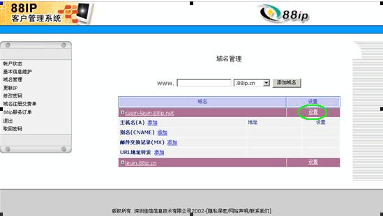 登錄88ip 客戶管理系統(tǒng)http://user.88ip.cn,選取左邊的“域名管理”,然后單擊需設(shè)置域名前面“ ”,展開域名設(shè)置項(xiàng),根據(jù)需求可添加相應(yīng)靜態(tài)ip 域名指向。(默認(rèn)指向當(dāng)前域名所解析的動(dòng)態(tài)ip) ,如下圖: