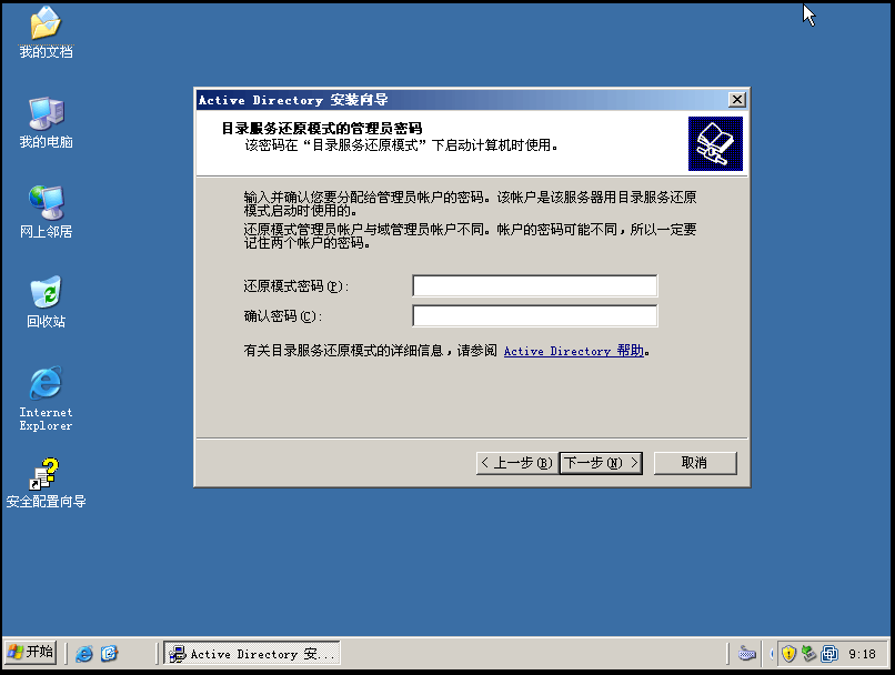 8、為活動(dòng)目錄設(shè)置還原密碼,還原密碼在后面?zhèn)浞?、還原活動(dòng)目錄時(shí),需要輸入還原密碼,在這里先不多說。