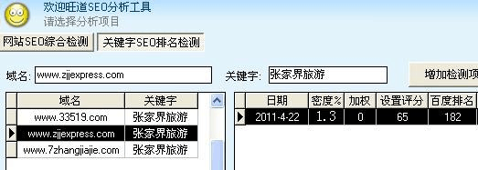 這三個網(wǎng)站都是旅游,關鍵字是:張家界旅游,我們先用旺道檢測工具查看網(wǎng)站的排名情況,因為關鍵詞有地域限制,地區(qū)是張家界,國內(nèi)一般用的是百度。