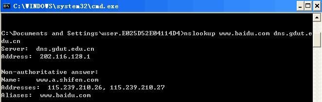 如:nslookup –type=NS gdut.edu.cn(或其它網(wǎng)址,如:中大sysu.edu.cn ,劍橋大學(xué)cam.ca.uk ,北大pku.edu.cn ,??)