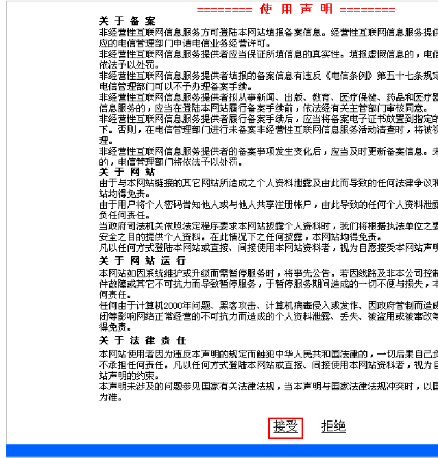 備案最新教程(圖文說明)第一步:進(jìn)入工信部備案網(wǎng)站www.miibeian.gov.cn ,點擊〖注冊〗 ,第二步:出現(xiàn)以下頁面,點擊〖接受〗