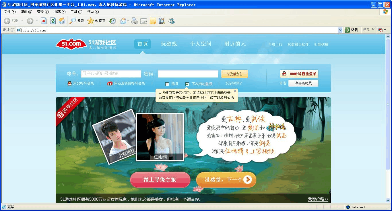 江湖地位:被坊間認為是“國內第二大交友社區(qū)網(wǎng)站”,2008年7月初史玉柱注資5100萬美元,51.com 開始從單純的社區(qū)網(wǎng)絡向社區(qū)網(wǎng)游化蛻變。