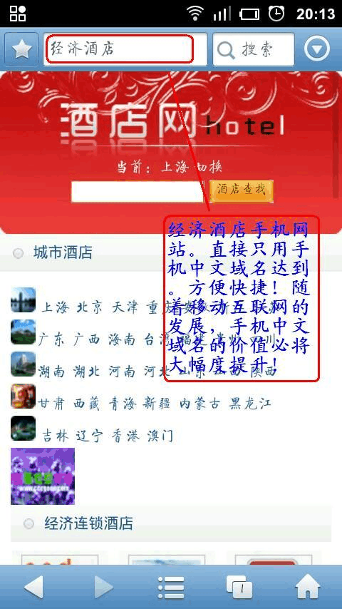 成功通過無線網(wǎng)址訪問經(jīng)濟(jì)酒店手機(jī)網(wǎng)站!沒有任何其他中間環(huán)節(jié),不需要百度、宜