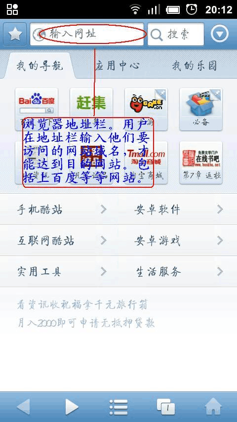 手機(jī)UC 瀏覽器等瀏覽器打開界面!瀏覽器的地址欄處,可以輸入網(wǎng)站的域名,
