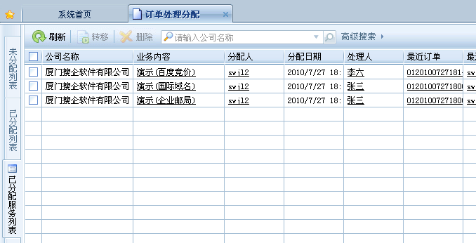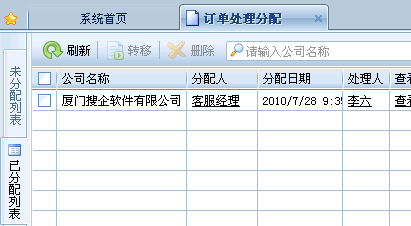 如下為應(yīng)用客戶模式,在未分配列表進(jìn)行客戶分配客服人員后的結(jié)果,可發(fā)現(xiàn)“未分配服務(wù)列表”同一客戶的產(chǎn)品服務(wù)都被自動(dòng)分配給同一人。從【訂單管理】>>【售后服務(wù)】里可以看到整個(gè)服務(wù)的詳細(xì)情況。
