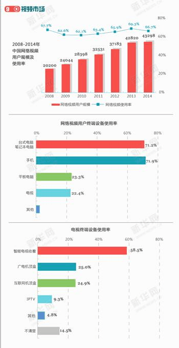 截至2014年12月,網(wǎng)絡視頻用戶規(guī)模達4.33億,比去年年底增加了478萬,用戶使用率為66.7,比2013年底下降了2.6個百分點。2014年的新增網(wǎng)民對網(wǎng)絡視頻的使用率在50左右,網(wǎng)絡視頻對新增網(wǎng)民的拉動作用減弱,從而導致網(wǎng)絡視頻的用戶規(guī)模持續(xù)增長,而使用率略有下降。