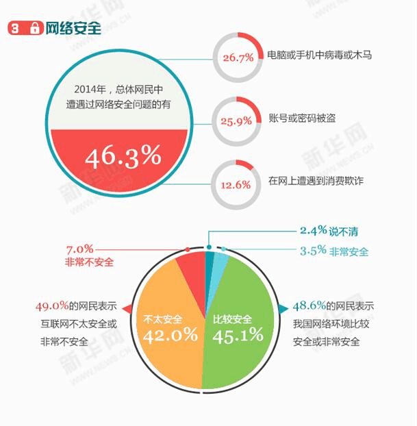 2014年,總體網(wǎng)民中有46.3的網(wǎng)民遭遇過網(wǎng)絡安全問題,在安全事件中,電腦或手機中病毒或木馬、賬號或密碼被盜情況最為嚴重,分別達到26.7和25.9,在網(wǎng)上遭遇到消費欺詐比例為12.6。本次調(diào)查顯示,有48.6的網(wǎng)民表示我國網(wǎng)絡環(huán)境比較安全或非常安全,49.0的網(wǎng)民表示互聯(lián)網(wǎng)不太安全或非常不安全。