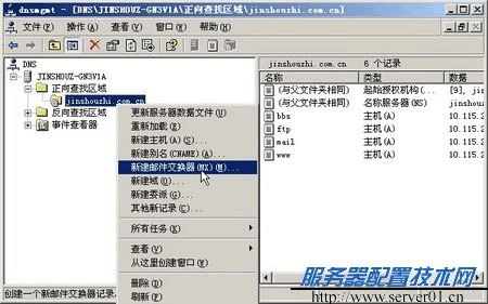 MX (Mail Exchanger ,郵件交換)記錄用以向用戶指明可以為該域接收郵件的服務器。那么為什么要添加MX 記錄呢?首先用戶來舉一個例子。如用戶準備發(fā)郵件給chhuian@jinshouzhi.com.cn ,這個郵件地址只能表明收郵件人在jinshouzhi.com.cn 域上擁有一個賬戶??墒莾H僅知道這些并不夠,因為電子郵件程序并不知道該域的郵件服務器地址,因此不能將這封郵件發(fā)送到目的地。而MX 記錄就是專門為電子郵件程序指路的,在DNS 服務器中添加MX 記錄后電子郵件程序就能知道郵件服務器的具體位置(即IP 地址)了。在主DNS 服務器中添加MX 記錄的操作步驟如下所述: