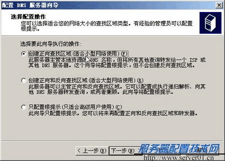 第2步,打開“配置DNS 服務器向導”對話框,在歡迎對話框中單擊【下一步】按鈕。打開“選擇配置操作”對話框,在默認情況下適合小型網(wǎng)絡使用的【創(chuàng)建正向查找區(qū)域】單選鈕處于選中狀態(tài)。保持默認設置并單擊【下一步】按鈕,如圖3所示。