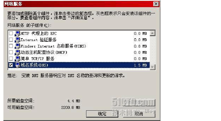 安裝DNS 組件非常簡單,依次點(diǎn)擊 控制面板-添加或刪除程序-添加/刪除Windows 組件-網(wǎng)絡(luò)服務(wù),如下圖所示,選擇“域名系統(tǒng)”即可。