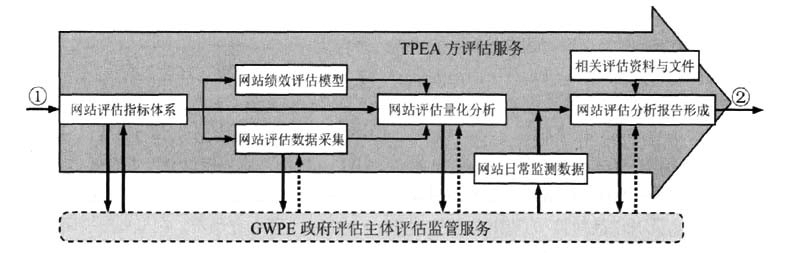 項(xiàng)目需求與實(shí)施策略討論、評(píng)估項(xiàng)目實(shí)施方案、評(píng)估項(xiàng)目合同、網(wǎng)站評(píng)估指標(biāo)體系、優(yōu)秀政府網(wǎng)站遴選等,即服務(wù)鏈上雙向?qū)嵕€表示的環(huán)節(jié);而GWPE政府評(píng)估主體對(duì)TPEA方評(píng)估服務(wù)的監(jiān)管環(huán)節(jié)有:網(wǎng)站評(píng)估指標(biāo)體系建立、網(wǎng)站評(píng)估數(shù)據(jù)采集、網(wǎng)站評(píng)估量化分析、網(wǎng)站評(píng)估分析報(bào)告形成、GWPE分析報(bào)告發(fā)布與優(yōu)秀網(wǎng)站典型分析等,即服務(wù)鏈上雙向虛實(shí)線表示的環(huán)節(jié)。