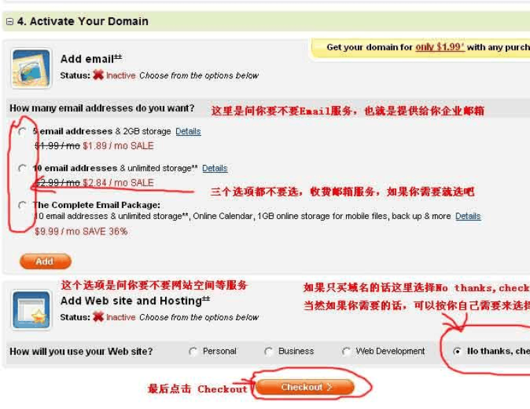 如果你只購(gòu)買域名就按上圖所示來(lái)選擇,最后點(diǎn)擊”Checkout ”按鈕跳轉(zhuǎn)到支付頁(yè)面