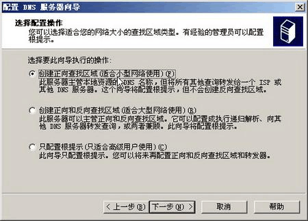 DNS服務器安裝完成以后會自動打開“配置DNS 服務器向導”對話框。在該向導的指引下開始創(chuàng)建第一個區(qū)域,操作步驟如下所述: