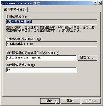 jinshouzhi.com.cn 域上擁有一個賬戶??墒莾H僅知道這些并不夠,因為電子郵件程序并不知道該域的郵件服務器地址,因此不能將這封郵件發(fā)送到目的地。而MX 記錄就是專門為電子郵件程序指路的,在DNS 服務器中添加MX 記錄后電子郵件程序就能知道郵件服務器的具體位置(即IP 地址)了。在主DNS 服務器中添加MX 記錄的操作步驟如下所述: